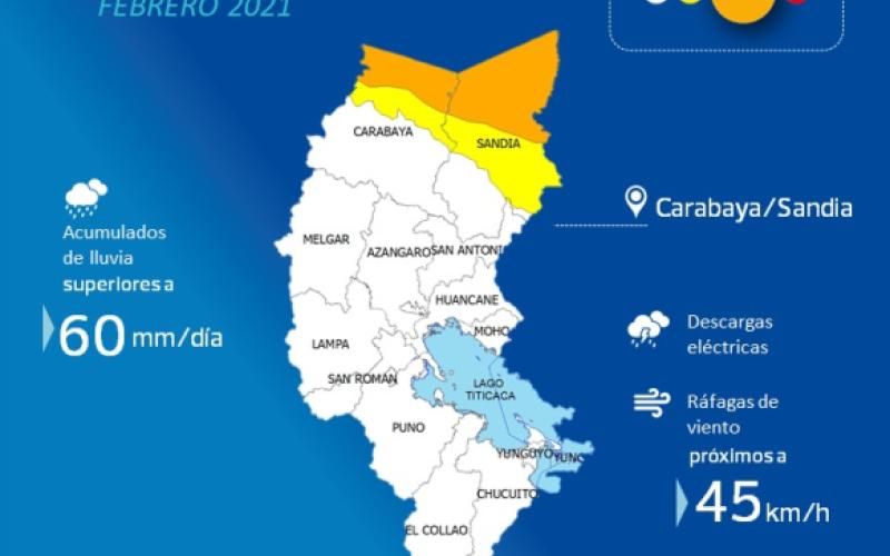 Lun, 08/03/2021 - 12:00 AVISO METEOROLOGICO PARA LA REGION DE PUNO. "LLUVIAS EN LA SELVA DE PUNO" Autor Oficina regional del SENAMHI en Puno COMPATIR Lluvias en la selva de Puno, martes 09 de febrero 2021. Metadatos Mostrar el registro completo del ítem