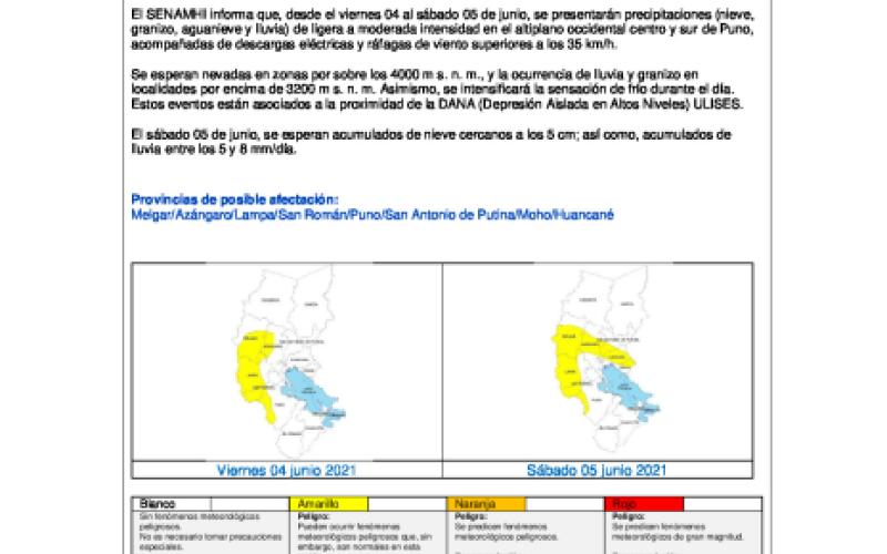 El SENAMHI informa que, desde el viernes 04 al sábado 05 de junio, se presentarán precipitaciones (nieve, granizo, aguanieve y lluvia) de ligera a moderada intensidad en el altiplano occidental centro y sur de Puno, acompañadas de descargas eléctricas y ráfagas de viento superiores a los 35 km/h.