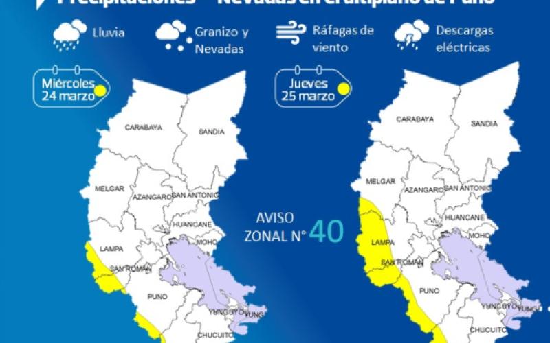 Precipitaciones y nevadas en el Altiplano de Puno, del miércoles 24 al jueves 25 de marzo, en las provincias de Melgar, Lampa, San Román, Puno, El Collao, Chucuito.