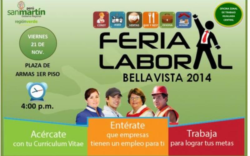 Por primera vez Bellavista será sede de la Feria Laboral y Vocacional 2014, en el cual se dará a conocer a la población, las ofertas laborales existentes de las diferentes empresas e instituciones públicas y privadas de la región. También participarán las instituciones de educación superior para toda aquella persona que quiera seguir una carrera profesional, ya sea universitaria o técnica.