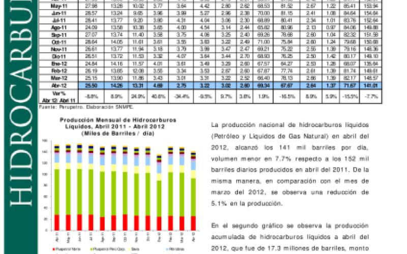 La producción nacional de hidrocarburos líquidos (Petróleo y Líquidos de Gas Natural) en abril del 2012, alcanzó los 141 mil barriles por día, volumen menor en 7.7% respecto a los 152 mil barriles diarios producidos en abril del 2011. De la misma manera, en comparación con el mes de marzo del 2012, se observa una reducción de 5.1% en la producción.En el segundo gráfico se observa la producción acumulada de hidrocarburos líquidos a abril del 2012, que fue de 17.3 millones de barriles, monto inferior en -6.8% al registrado en el mismo periodo del 2011.Es importante resaltar que del total de la producción acumulada en el presente año, 4.38 millones de barriles pertenecen al Lote 56 (25.2% del total), 4.32 millones de barriles al Lote 88 (24.8% del total), y los 8.68 millones de barriles restantes (50% del total) a los otros lotes en producción.