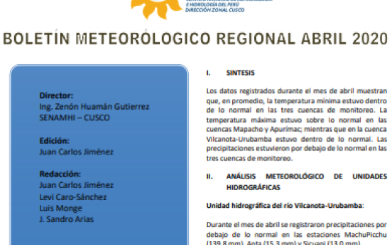 Boletín Hidrometeoro lógico de la Dirección Zonal 12 Apurímac, Cusco - Madre de Dios Abril 2020