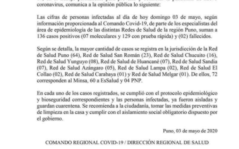 La Dirección Regional de Salud (DIRESA) Puno, y el Comando Regional Covid-19, en el trabajo permanente para prevenir y controlar la pandemia de nuevo coronavirus, comunica a la opinión pública las cifras de personas infectadas al día de hoy domingo 03 de mayo de 2020.