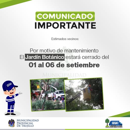 Del lunes 01 al sábado 06 de setiembre, el Jardín Botánico permanecerá cerrado por mantenimiento de sus áreas verdes.