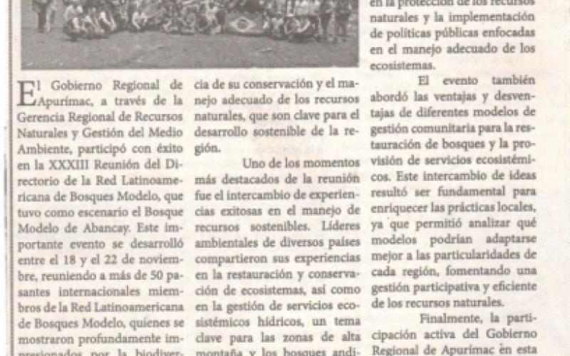El Gobierno Regional de Apurímac, a través de la Gerencia Regional de Recursos Naturales y Gestión del Medio Ambiente, participo con éxito en la XXXIII Reunión del Directorio de la Red Latinoamericana de Bosques Modelo, que tuvo como escenario el Bosque Modelo de Abancay.