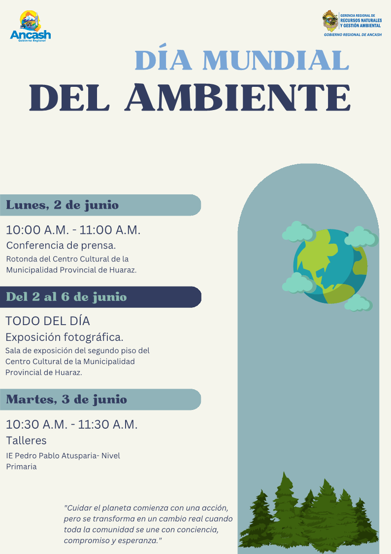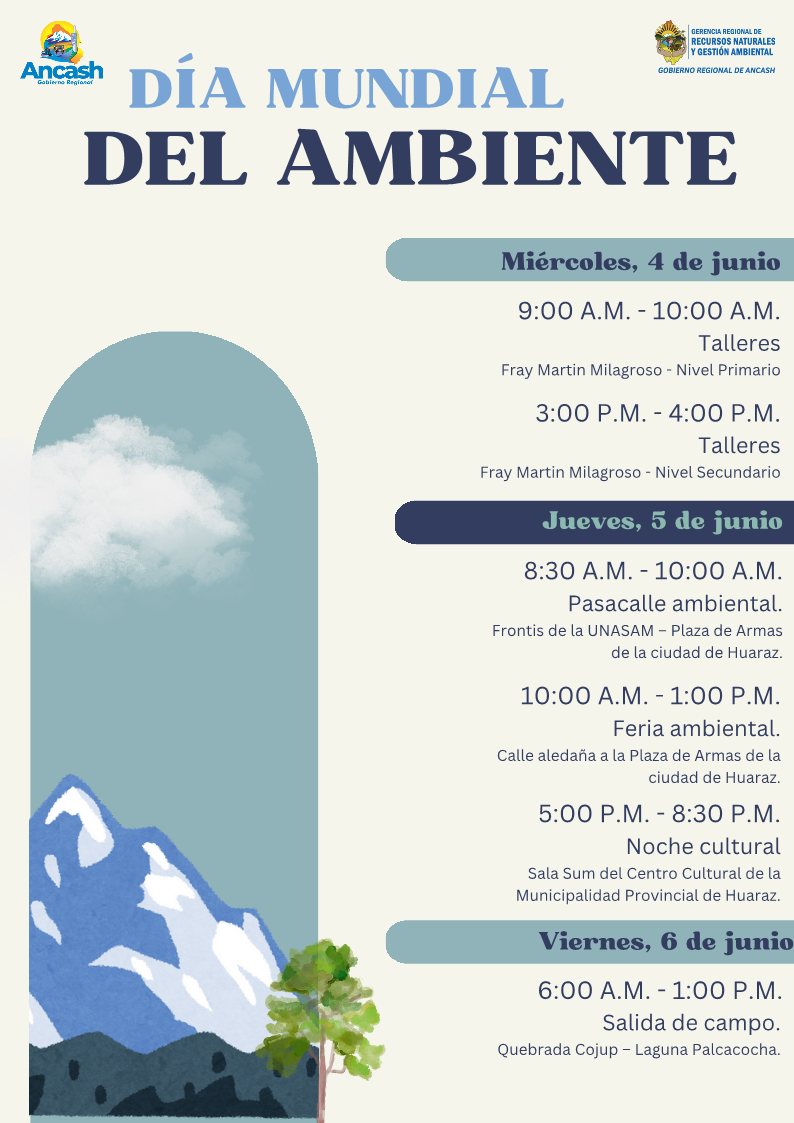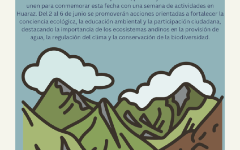 Cada 5 de junio se celebra el Día Mundial del Ambiente, y en Áncash, diversas instituciones del sector público, privado y de la sociedad civil se unen para conmemorar esta fecha con una semana de actividades en Huaraz. Del 2 al 6 de junio se promoverán acciones orientadas a fortalecer la conciencia ecológica, la educación ambiental y la participación ciudadana, destacando la importancia de los ecosistemas andinos en la provisión de agua, la regulación del clima y la conservación de la biodiversidad.