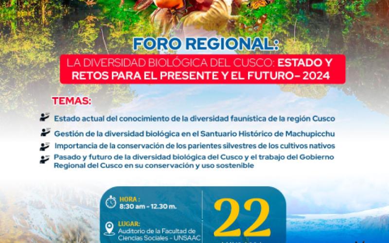 El Gobierno Regional Cusco a través de la Gerencia Regional de Recursos Naturales y Gestión Ambiental, conjuntamente con el Grupo Técnico Regional de Educación Ambiental Cusco, organizaron y realizaron el Foro regional: LA DIVERSIDAD BIOLÓGICA DEL CUSCO: ESTADO Y RETOS PARA EL PRESENTE Y EL FUTURO -2024, evento desarrollado el día 22 de mayo en el Auditorio de la Facultad de ciencias sociales de la Universidad Nacional de San Antonio Abad del Cusco, donde participaron alrededor de 200 estudiantes universitarios y siete instituciones educativas con sus brigadas ambientales, docentes y público interesado.