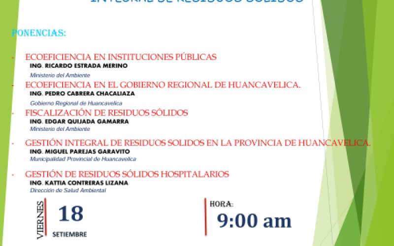 Por motivo de celebrar el Día Interamericano de la limpieza y la gestión integral de residuos sólidos en el Perú, asi como también dando la iniciativa a implementar las medidas de ecoeficiencia en instituciones públicas; el Gobierno Regional de Huancavelica a traves de la Gerencia Regional de Recursos Naturales y Gestión Ambiental en coordinación con la Municipalidad Provincial de Huancavelica y el Colegio de Ingenieros del Perú Consejo Departamental de Huancavelica, se tiene programado desarrollar el curso de capacitación ECOEFICIENCIA EN INSTITUCIONES PÚBLICAS Y GESTIÓN INTEGRAL DE RESIDUOS SÓLIDOS, que se llevará acabo el día 18 de setiembre del 2015 en el auditorio Manchego Muñoz de la Municipalidad Provincial de Huancavelica a horas 9am - 1pm.