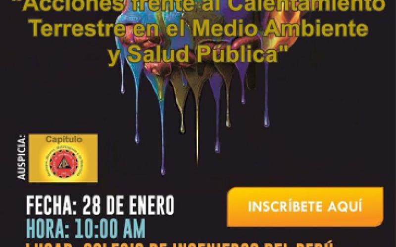 Se invita al Foro "Acciones frente al calentamiento terrestre en el medio ambiente y salud pública" por celebrarse el Día Mundial de la Acción frente el Calentamiento Global – 28 de EneroOrganiza: Segat - CIP La Libertad Capítulo de Ingeniería Geológica, Minas, Metalúrgica y Materiales.Link de Programa Digital: http://goo.gl/CMo0Td