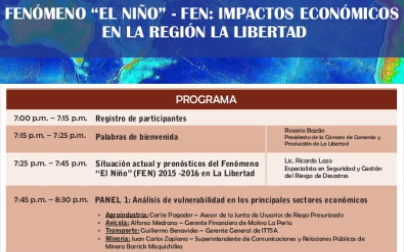 Invitamos a participar en el Foro FENOMENO DEL NIÑO: IMPACTOS ECONOMICOS EN LA REGION LA LIBERTAD, a llevarse a cabo el miércoles 9 de diciembre a las 7.00 pm en nuestra sede institucional.
