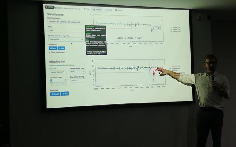 Durante la capacitación se mostró la plataforma SEPAL, que es una herramienta totalmente online que trabaja con imágenes de satélite en línea, sin necesidad de descargarla (procesamiento back-end) y permite hacer varias funcionalidades como mosaicos, detección de cambios, series de tiempo, entre otros. Además de contar con otras potencialidades como un módulo integrado del software R para estadística y programación.