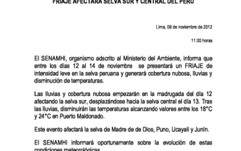 El SENAMHI, organismo adscrito al Ministerio del Ambiente, informa que entre los días 12 al 14 de noviembre se presentará un FRIAJE de intensidad leve en la selva peruana y generará cobertura nubosa, lluvias y disminución de temperaturas.