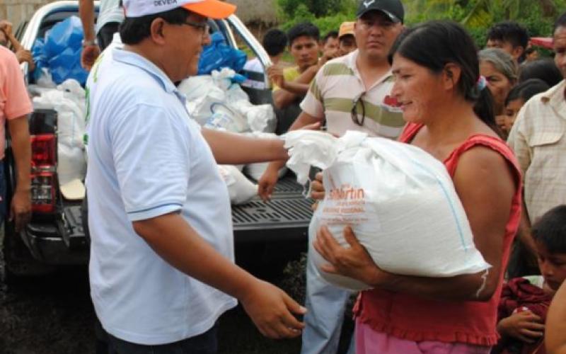 El Gobernador Regional de San Martín, Víctor Noriega Reátegui, llevo ayuda humanitaria consistente en kits de alimentos, frazadas, colchones, mosquiteros, carretillas y herramientas a las familias de las localidades de Nauta y Agua Blanca de la provincia de El Dorado, quienes fueron consideradas damnificadas luego de la crecida de la quebrada Pao, que causó estragos en la madrugada del día sábado 18 de abril.