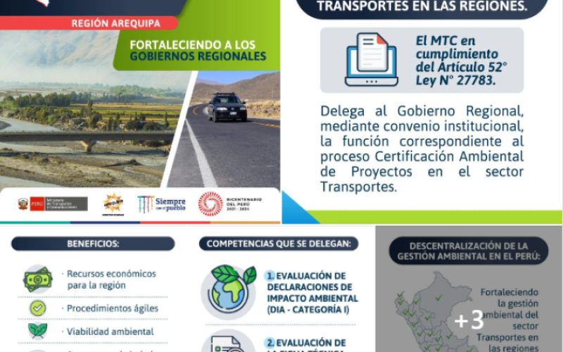El Gobierno Regional de Arequipa se encuentra ejecutando competencias ambientales delegadas por el MTC, para otorgar certificaciones ambientales a proyectos de inversión pública del sector transportes.