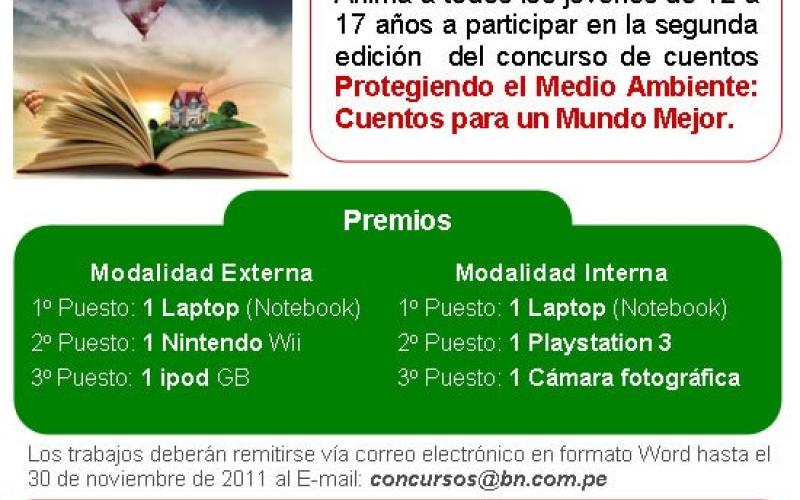 En cumplimiento con su política de Responsabilidad Social Empresarial (RSE), el Banco de la Nación (BN) ha organizado el II Concurso de Cuentos: “Protegiendo el Medio Ambiente, Cuentos para un Mundo Mejor”, con la finalidad de que los estudiantes de secundaria del país demuestren su talento literario y tomen conciencia de la importancia del cuidado del ambiente.