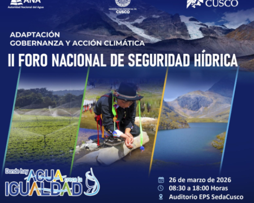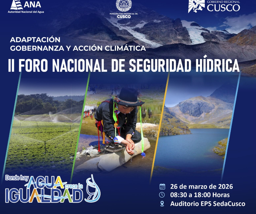 El Gobierno Regional Cusco a traves de la Gerencia Regional de Recursos Naturales y Gestión Ambiental, conjuntamente con la Autoridad Administrativa del Agua UV, el Consejo de Recursos Hidricos de la Cuenca Interregional UV, IMA, AGRIRURAL, SEDA CUSCO, Centro Bartolomé de las Casas, PREDES, Universidad Andina del Cusco, lanzaron Organizaron y Realizaron el II: Foro Nacional de Seguridad hídrica “Adaptación, Gobernanza y Acción Climática, Agua crece la Igualdad, con el objetivo de pPromover el diálogo y la articulación multisectorial para fortalecer la implementación del Plan de Gestión de Recursos Hídricos de Cuenca Interregional Vilcanota Urubamba (PGRHCI.VU), como instrumento de planificación integrada y de priorización de políticas públicas que permitan alcanzar el uso sostenible del recurso hídrico en un enfoque de cambio climático y seguridad hídrica.