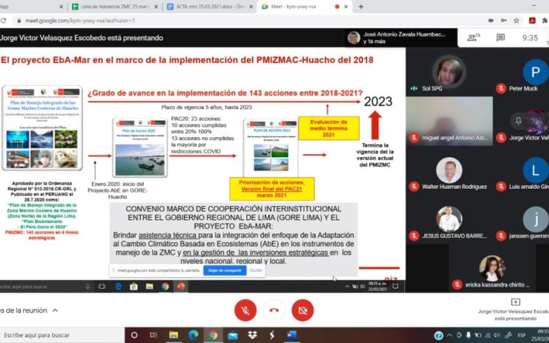 En esta sesión se realizó la presentación del Plan de Acción 2021, orientado a la Implementación del Plan de Manejo Integrado de la Zona Marino Costera de Lima, la cual contiene 13 acciones a desarrollarse a lo largo del presente año, con temáticas orientadas a la conservación de ecosistemas de humedales y lomas, turismo sostenible, desarrollo y fortalecimiento de la actividad de pesca artesanal, entre otros.