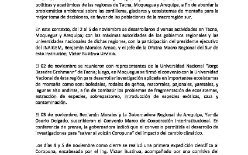 Como parte de la agenda científica nacional en glaciares y ecosistemas de montañas, el INAIGEM suscribió acuerdos de trabajo conjunto y sostuco encuentros con autoridades políticas y académicas de las regiones de Tacna, Moquegua y Arequipa, a fin de abordar la problemática ambiental sobre las cordilleras, glaciares y ecosistemas de montaña para la mejor toma de decisiones, en favor de las poblaciones de la macroregión sur.