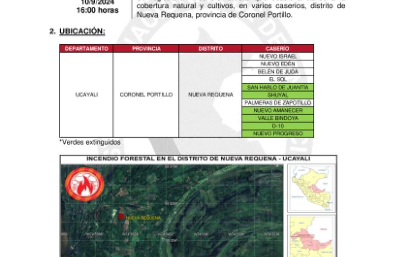 El 10/09/2024, se registra un incendio forestal que ocasiona daños a la cobertura natural y cultivos, en varios caseríos, distrito de Nueva Requena, provincia de Coronel Portillo.
