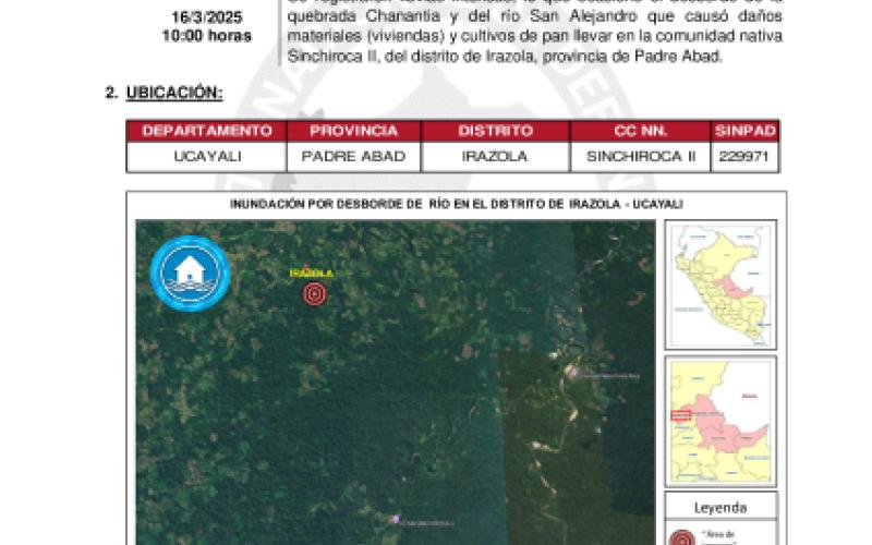 Informe de emergencia Nº 804-7/04/2025/COEN-INDECI, Inundación por desborde de río en el Distrito de Irazola, a causa de lluvias intensas, ocasionó el desborde de la quebrada Chanantia y río San Alejandro, causó daños materiales y cultivos de pan llevar en la CC.NN. Sinchi Roca II, distrito de Irazola, provincia de Padre Abad