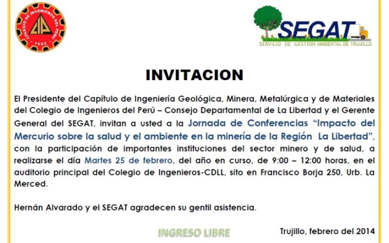El Servicio de Gestión Ambiental de Trujillo – SEGAT desarrollará conjuntamente con el Colegio de Ingenieros del Perú – Concejo Departamental de La Libertad esta Jornada de Conferencias, el 25 de Febrero por celebrarse el 23 de Febrero el “DIA DEL COMPROMISO INTERNACIONAL DEL CONTROL DEL MERCURIO”.