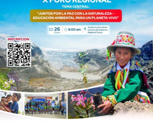 El Gobierno Regional Cusco a través de la Gerencia Regional de Recursos Naturales y Gestión Ambiental y el Grupo Técnico Regional de Educación conformado por instituciones públicas, de la sociedad civil y privados. Presentaron el X FORO REGIONAL: JUNTOS POR LA PAZ CON LA NATURALEZA - EDUCACIÓN AMBIENTAL PARA UN PLANETA VIVO.