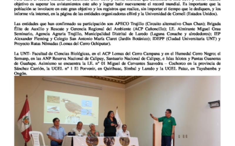 La Libertad está lista para participar en la quinta edición del Global Big Day (GBD) y como todo el Perú, para lograr por tercera vez, batir el record mundial de avistamiento de aves. A la fecha hay 15 instituciones entre públicas y privadas que han confirmado su salida para el próximo 4 de mayo, entre ellas el gobierno regional de La Libertad, con las gerencias regionales del Ambiente y Agricultura, afirmó el Gerente Regional del Ambiente, Frank Sánchez, luego de concluida la conferencia de prensa de lanzamiento.