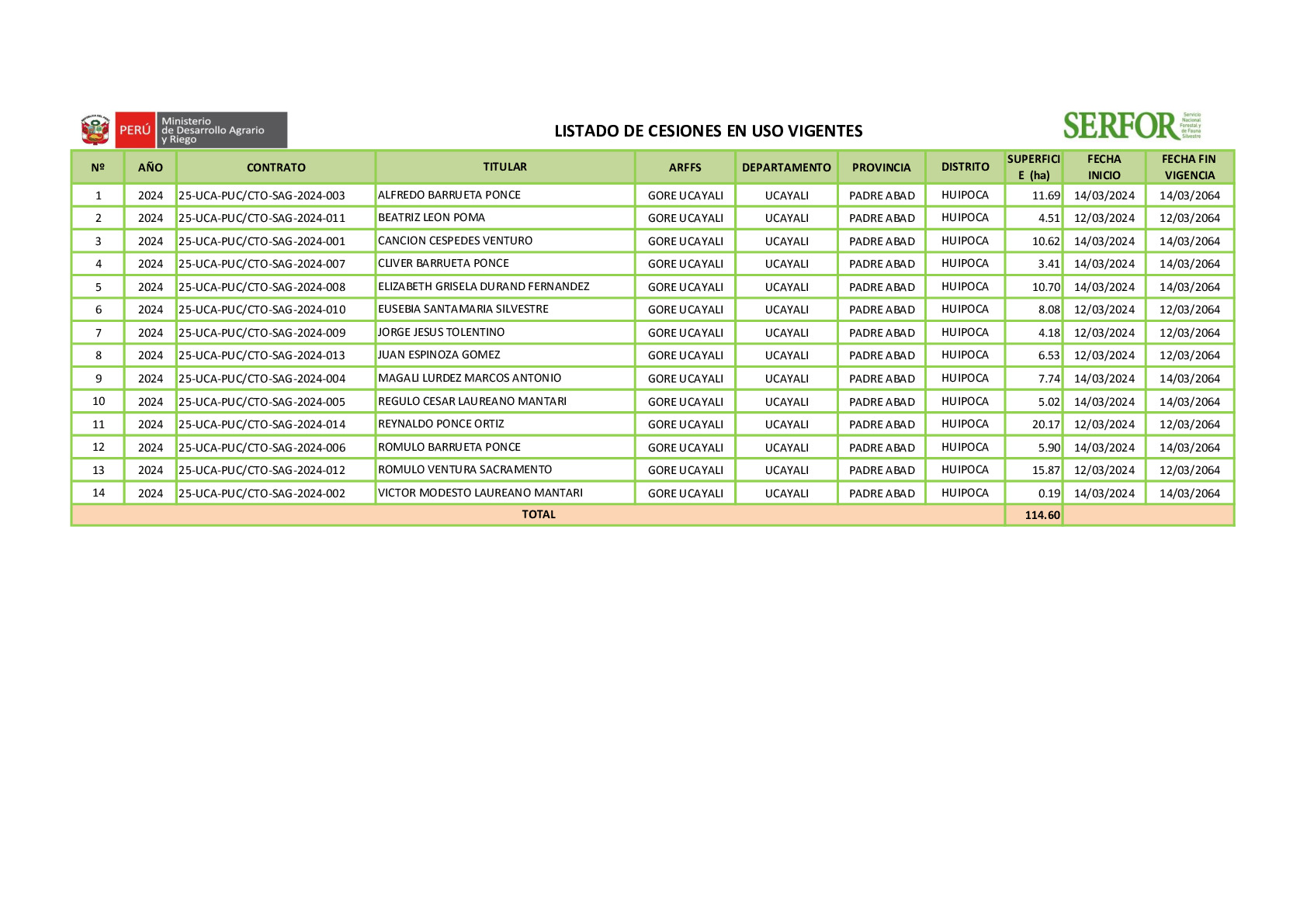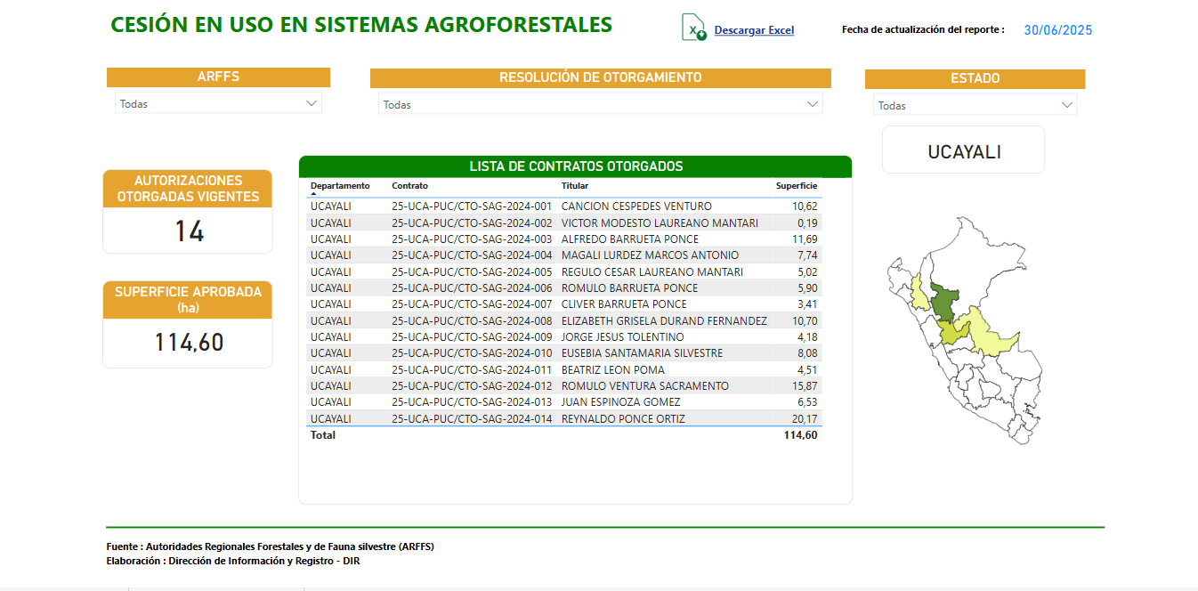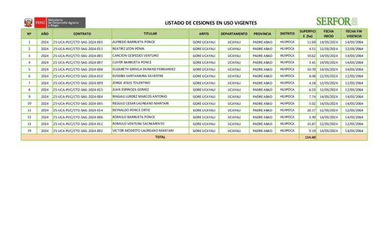 Según reporte del Componente Estadístico - SNIFFS, realizada por el SERFOR , se da a conocer la Lista de Cesión en Uso en Sistemas Agroforestales - CUSAF , Otorgadas al 2025 en la Región Ucayali, con la finalidad de formalizar las actividades agrícolas, forestales y pecuarias de los agricultores familiares en tierras forestales y de protección, otorgándoles un título habilitante para realizar prácticas productivas sostenibles.