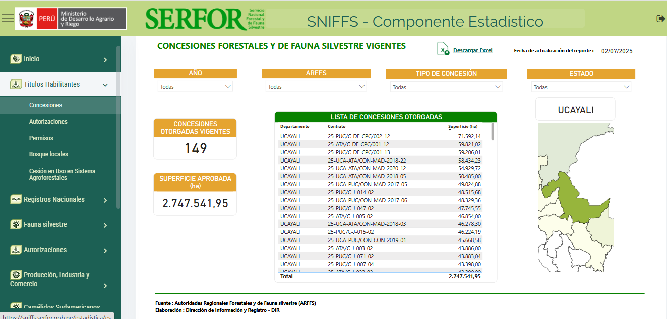 Según reporte del Componente Estadístico - SNIFFS, realizada por el SERFOR , se da a conocer la Lista de Concesiones Forestales y de Fauna Silvestre Otorgadas al 2025 en la Región Ucayali.