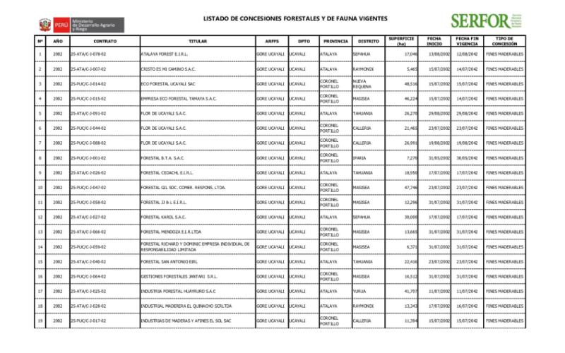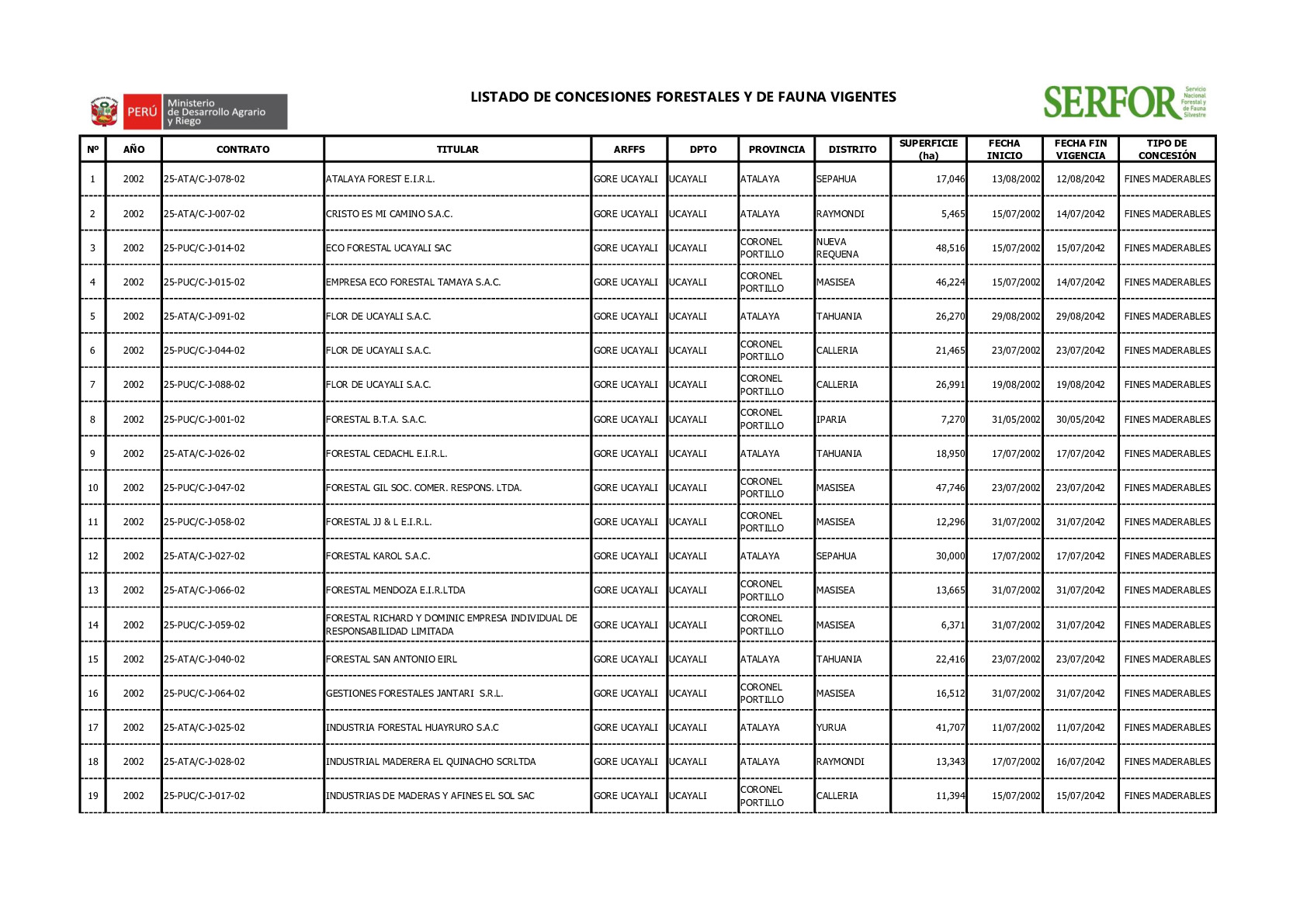Lista de Concesiones Forestales y de Fauna Silvestre Otorgadas al 2025 en la Región Ucayali
