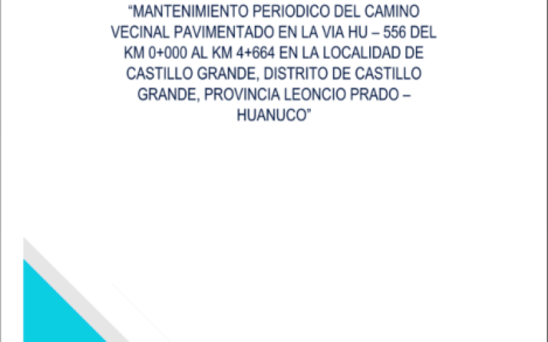 El Instituto Vial Provincial – Leoncio Prado mediante la solicitud de la población beneficiarios y autoridades de la zona realiza la Elaboración del Expediente Técnico denominado “MANTENIMIENTO PERIODICO DEL CAMINO VECINAL PAVIMENTADO EN LA VIA HU – 556 DEL KM 0+000 AL KM 4+664 EN LA LOCALIDAD DE CASTILLO GRANDE, DISTRITO DE CASTILLO GRANDE, PROVINCIA LEONCIO PRADO – HUANUCO”