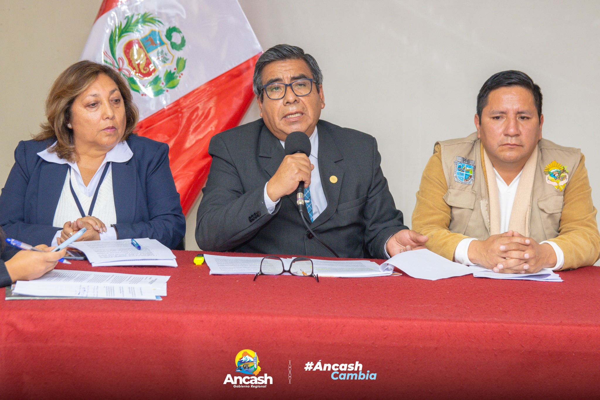 * En el marco del trabajo articulado para enfrentar la problemática ambiental en la región, los integrantes de la “Mesa de Trabajo Multisectorial para Atender la Salud de la Población Expuesta a Metales Pesados, Metaloides y Otras Sustancias Químicas en la Región Áncash”, realizaron conferencia de prensa para informar los avances de las acciones interinstitucionales frente a la problemática de contaminación del suelo por metales pesados en la I.E. N° 86841 “Cesar Vallejo” de Chacas. La conferencia contó con la participación del Gerente regional de Recursos Naturales y Gestión Ambiental, Mg. Yeng Dennis Castillo Torre, el director regional de Salud, Dr. Ricardo Natividad Collas; el Director Regional de la DREA, Lic. Edver Paredes Milla; la Directora Ejecutiva del SENASA Ancash, Ing. Laura Acosta Diaz; el Director de Salud Ambiental de la DIRES., Ing. Gerardo Norabuena Maguiña; el Subgerente de Gestión Ambiental, Mg. Miguel Santa María Flores; el especialista de la Dirección Regional de Energía y Minas (DREM), Ing. Vingnny Ocrospoma Lopez.