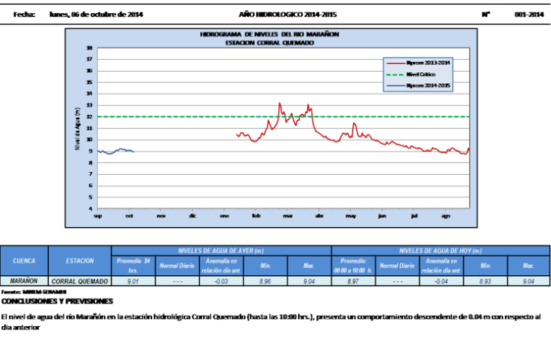 El Servicio Nacional de Meteorologica e Hidrologia a traves de la Dirección Regional de Lambayeque, muestra el reporte hidrologico en la estacion Corral Quemado, cuenca del Marañon.