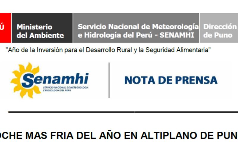 nota de prensa sobre las temperaturas minimas que se vienen registrando en altiplano de Puno desde el 26 de mayo de 2013. Heladas generalizadas en todo el altiplano de Puno. Se espera que estas condiciones continúen hasta el sábado 01 de junio de 2013, luego del cual se esperan que las temperaturas mínimas incrementen ligeramente por un periodo corto, pero mayor persistencia y frecuencia de heladas durante el mes de junio.
