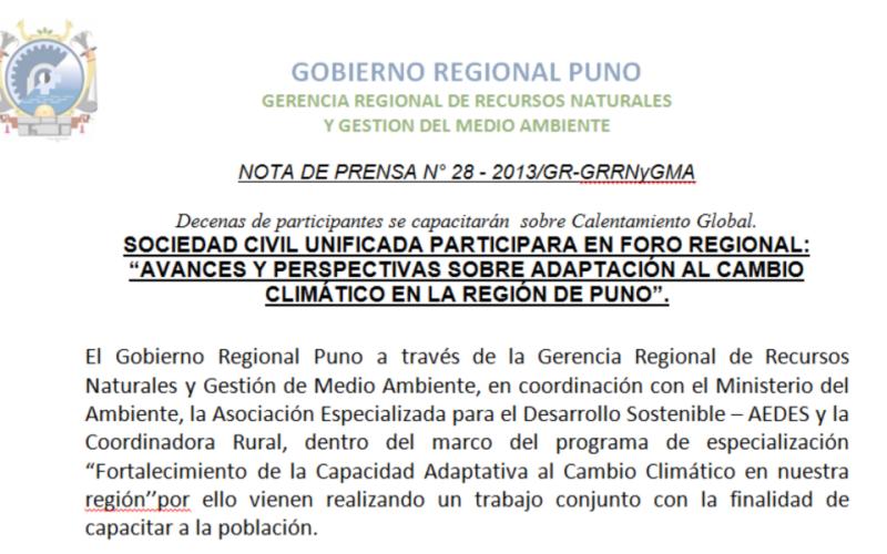 NOTA DE PRENSA: SOCIEDAD CIVIL UNIFICADA PARTICIPARA EN FORO REGIONAL: “AVANCES Y PERSPECTIVAS SOBRE ADAPTACIÓN AL CAMBIO CLIMÁTICO EN LA REGIÓN DE PUNO”.