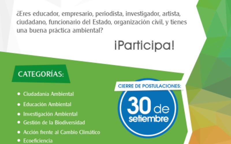 El Premio Nacional Ambiental 2016 cuenta con ocho categorías: (1) Cultura y Ciudadanía Ambiental, (2) Educación Ambiental, (3) Ecoeficiencia, (4) Investigación Ambiental, (5) Gestión de la Biodiversidad, (6) Acción frente a la Variabilidad y Cambio Climático, (7) Periodismo y Publicaciones y (8) Categoría Temática.
