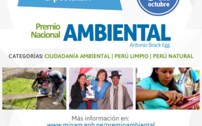 Las postulaciones se recibirán hasta el 31 de octubre. Los interesados pueden obtener mayor información ingresando a www.minam.gob.pe/premioambiental o llamando al teléfono (01) 611 6000, anexo 1325.