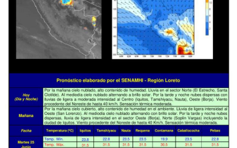 El presente documento nos muestra el pronostico regional diario valido desde las 06.30 horas del día 25 de junio de los corrientes hasta las 06.30 horas del día 26 de junio; esta información ha sido generado por la Dirección Regional de SENAMHI - Loreto.
