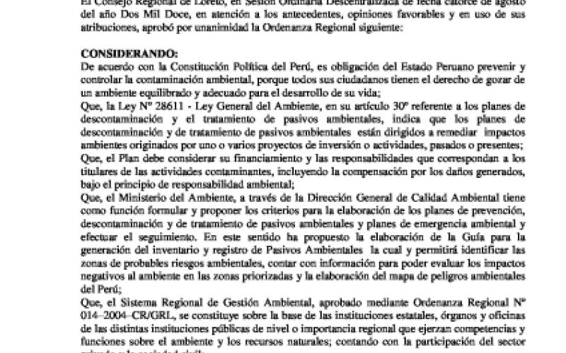 El Consejo Regional de Loreto, en Sesión Extraordinaria Descentralizada de fecha catorce de agosto del año Dos Mil Doce, en atención a los antecedentes, opiniones favorables y en uso de sus atribuciones, aprobó por unanimidad la Ordenanza Regional Nº 015-2012-GRL-CR “Creación del Grupo Técnico para Remediación de Pasivos Ambientales en Loreto”., el mismo que se encargará de elaborar, a través de un proceso participativo regional, una propuesta de la Estrategia Regional de Remediación de Pasivos Ambientales y su Plan de Acción al 2021.