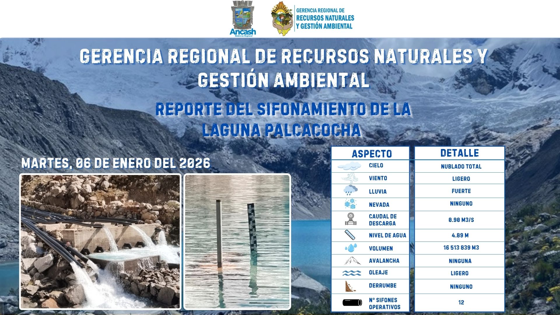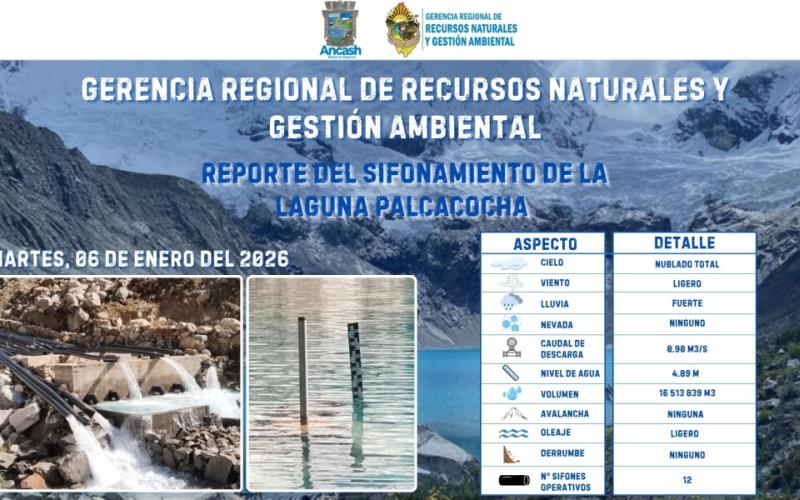 La Gerencia Regional de Recursos Naturales y Gestión Ambiental reporta que, al 06 de enero del 2026, se realizó el monitoreo del sifonamiento de la Laguna Palcacocha, registrándose 12 sifones operativos, garantizando el control del nivel del agua y la seguridad aguas abajo.