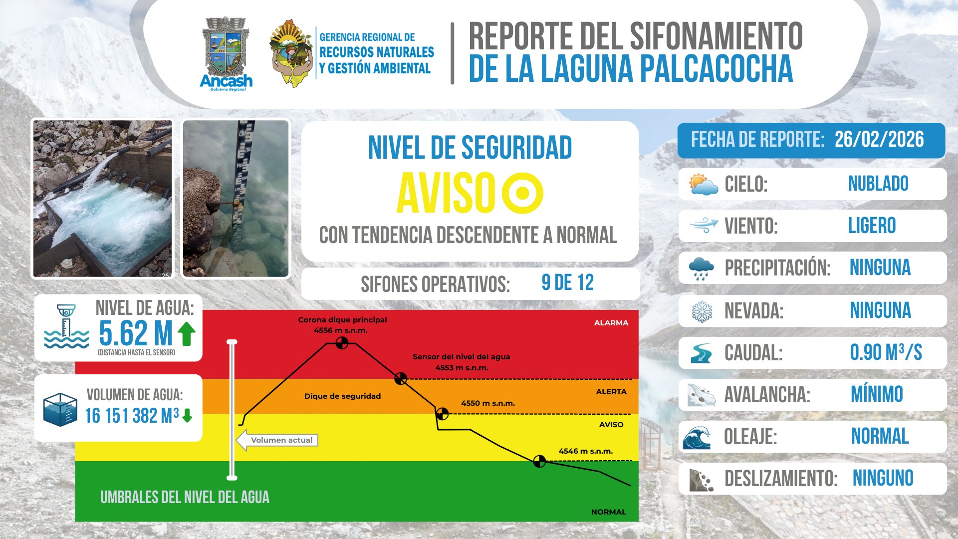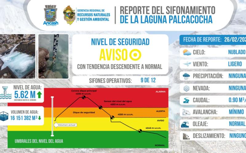 La Gerencia Regional de Recursos Naturales y Gestión de Medio Ambiente reporta que, al 26 de febrero del 2026, se realizó el monitoreo del sifonamiento de la Laguna Palcacocha, registrándose 09 sifones operativos, garantizando el control del nivel del agua y la seguridad aguas abajo.
