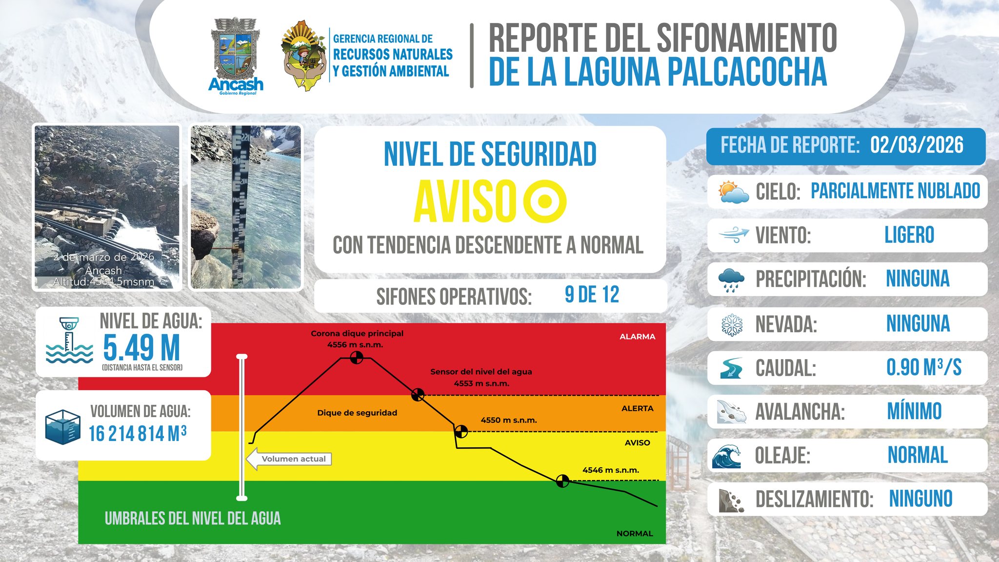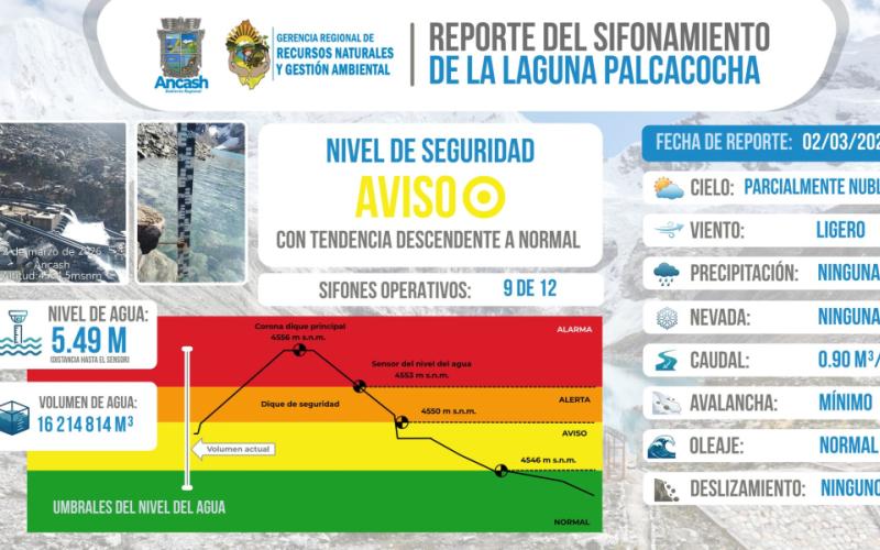La Gerencia Regional de Recursos Naturales y Gestión de Medio Ambiente reporta que, al 02 de marzo del 2026, se realizó el monitoreo del sifonamiento de la Laguna Palcacocha, registrándose 09 sifones operativos, garantizando el control del nivel del agua y la seguridad aguas abajo.
