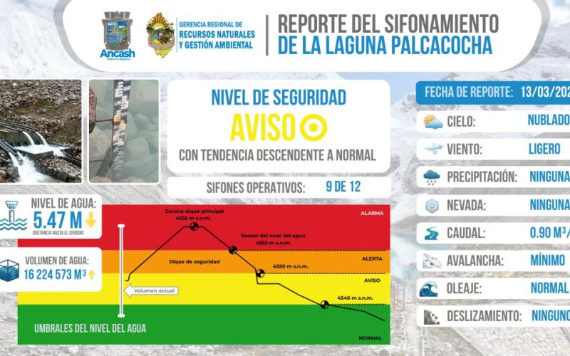 La Gerencia Regional de Recursos Naturales y Gestión de Medio Ambiente reporta que, al 13 de marzo del 2026, se realizó el monitoreo del sifonamiento de la Laguna Palcacocha, registrándose 09 sifones operativos, garantizando el control del nivel del agua y la seguridad aguas abajo.