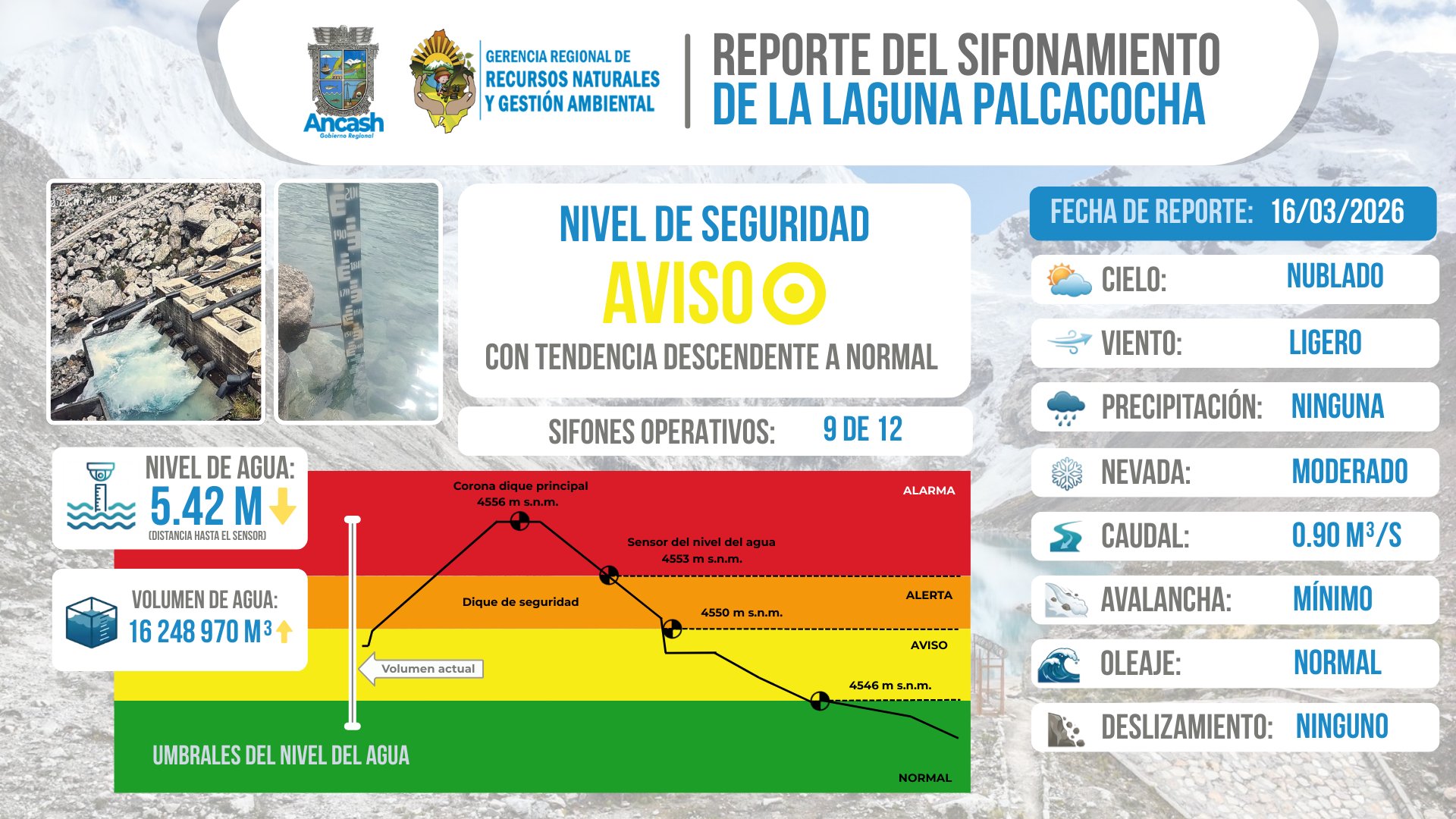 La Gerencia Regional de Recursos Naturales y Gestión de Medio Ambiente reporta que, al 16 de marzo del 2026, se realizó el monitoreo del sifonamiento de la Laguna Palcacocha, registrándose 09 sifones operativos, garantizando el control del nivel del agua y la seguridad aguas abajo.