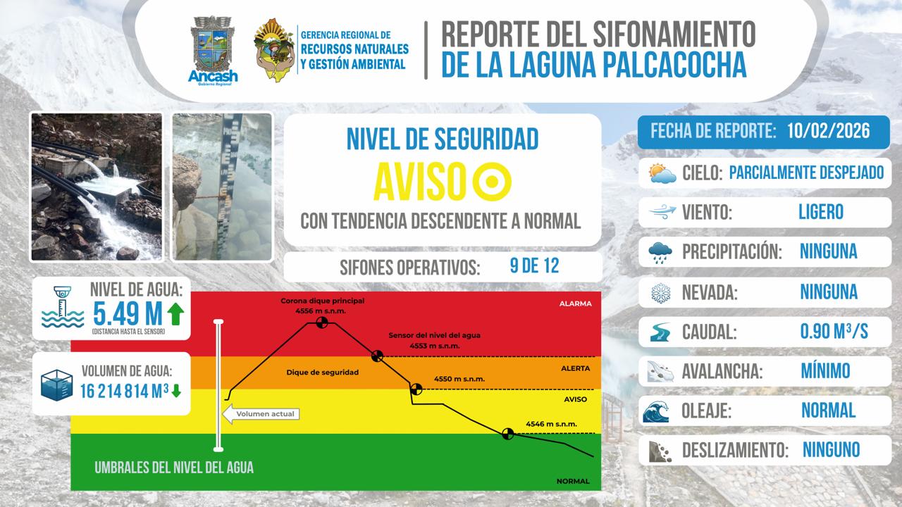 La Gerencia Regional de Recursos Naturales y Gestión de Medio Ambiente reporta que, al 10 de febrero del 2026, se realizó el monitoreo del sifonamiento de la Laguna Palcacocha, registrándose 09 sifones operativos, garantizando el control del nivel del agua y la seguridad aguas abajo.