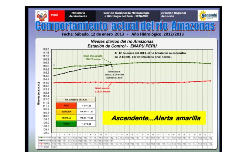 · Rio Amazonas, tendencia ascendente, alerta AMARILLA; Al 12 de enero del 2013, el río Amazonas se encuentraen 2.13 mts. por encima de su nivel normal.