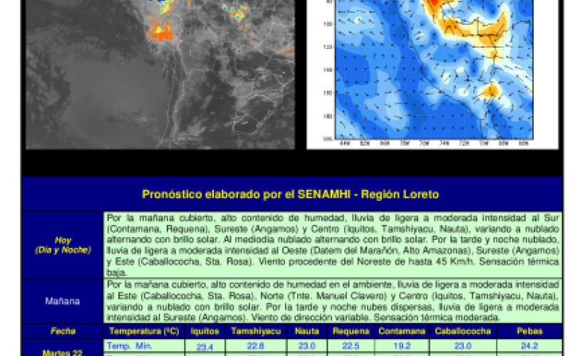 Por la mañana cubierto, alto contenido de humedad en el ambiente, lluvia de ligera a moderada intensidad al Este (Caballococha, Sta. Rosa), Norte (Tnte. Manuel Clavero) y Centro (Iquitos, Tamshiyacu, Nauta), variando a nublado con brillo solar. Por la tarde y noche nubes dispersas, lluvia de ligera a moderada intensidad al Sureste (Angamos). Viento de dirección variable. Sensación térmica moderada.