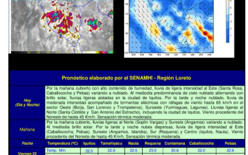 PRONOSTICO REGIONAL DIARIO Y COMPORTAMIENTO HIDROLÓGICO DE LOS PRINCIPALES RIOS AMAZONICOS - 22.FEB.2013 HOY – DIA Y NOCHE  Por la mañana cubierto con alto contenido de humedad, lluvia de ligera intensidad al Este (Santa Rosa, Caballococha y Pebas) variando a nublado. Al mediodía predominancia de cielo nublado alternando con brillo solar, lluvias ligeras aisladas en la ciudad de Iquitos. Por la tarde y noche nublado, lluvia de moderada intensidad acompañado de tormentas eléctricas con ráfagas de viento hasta 65 km/h en el sector Oeste (Borja, San Lorenzo y Trompeteros), Suroeste (Yurimaguas, Lagunas). Lluvias ligeras al Norte (Santa Clotilde y San Antonio del Estrecho), incluyendo la ciudad de Iquitos. Viento procedente del Noreste de hasta 45 Km/h. Sensación térmica moderada. MAÑANA  Por la mañana cubierto, lluvias ligeras al Norte (Soplin Vargas) y Sureste (Angamos) variando a nublado. Al mediodía brillo solar. Por la tarde y noche nubes dispersas, lluvia de ligera intensidad al Este (Caballococha, Pebas), Sureste (Angamos, Islandia), Sur (Requena) y Centro (Iquitos, Nauta). Viento procedente del Noreste de hasta 45 Km/h. Sensación térmica moderada. COMPORTAMIENTO HIDROLOGICO ACTUAL DE LOS PRINCIPALES RIOS DE LA CUENCA AMAZONICA DEL 22 DE FEBRERO DEL 2013       ·         Rio Amazonas. El Río Amazonas tiene un comportamiento oscilante, encontrándose en alerta hidrológica amarilla, con un aumento de 0.08 m respecto del día anterior y con una cota actual de 116.80 msnm superior en 1.40 m respecto del nivel normal; pero por debajo del nivel reportado el 22 de febrero del 2012 con una diferencia de 0.47 m en relación al nivel actual.   ·         Rio Huallaga El río Huallga al 22 de febrero del 2013 tiene un comportamiento oscilante, encontrándose en alerta hidrológica roja, con un disminución de 0.16 m respecto del día anterior;el reporte nos muestra una cota actual de 133.72 msnm, superior en 1.49 m y 0.11 m a su nivel normal y del registro del 15 de febreo del año 2012 respectivamente.  ·         Rio Marañon El río Marañón al 22 de febrero del 2013 tiene un comportamiento ascendente, encontrándose en alerta hidrológica roja mostrando una aumento de nivel de 0.03 m respecto del día anterior;  una diferencia de 0.54 m respecto del nivel mostrado la misma fecha del año 2012 y siendo superior en 3.93 m respecto de su nivel normal. ·         Rio Ucayali, El río Ucayali al 22 de febrero del año 2013 tiene un comportamiento ascendente estando en alerta hidrológica roja y mostrando un nivel actual  de 132.13 msnm con un aumento de 0.04 m respecto del día anterior y  encontrándose a 2.06 m y 0.83 m por encima de su nivel normal y del nivel mostrado en la misma fecha para el año 2012.   ·         Rio Corrientes El río corrientes al 22 de febrero del 2013 tiene un comportamiento ascendente, con un descenso de0.35 m respecto del día anterior; el reporte nos muestra una cota actual de 4.98 m superior en 1.94 m respecto de su nivel normal y 1.5 m al registro del 22 de febrero del año 2012.