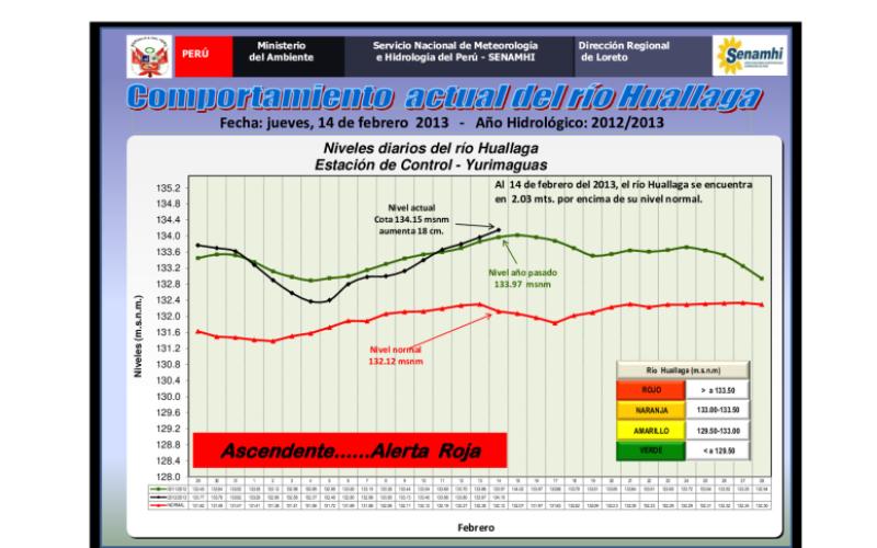 El río Huallga al 14 de febrero del 2013 tiene un comportamiento ascendente , encontrándose en alerta hidrológica roja, con un aumento de 0.18 m respecto del día anterior;el reporte no muestra una cota actual de 134.15 msnm, superior en 2.03 m y 0.18 m respecto de su nivel normal y del registro del año 2012.