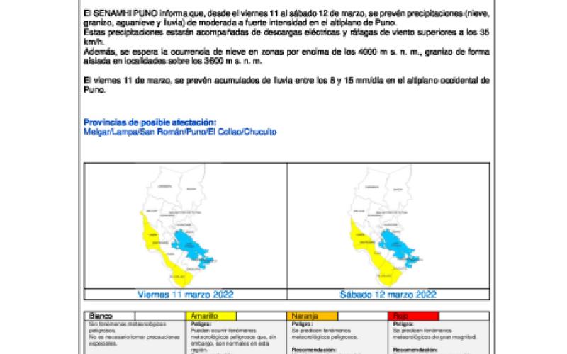 El SENAMHI PUNO informa que, desde el viernes 11 al sábado 12 de marzo, se prevén precipitaciones (nieve, granizo, aguanieve y lluvia) de moderada a fuerte intensidad en el altiplano de Puno.